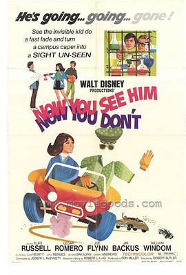 Now You See Him, Now You Don't is a 1972 Walt Disney Productions film starring Kurt Russell as a chemistry student who accidentally discovers the secret to invisibility. It is the sequel to the 1969 film The Computer Wore Tennis Shoes and was followed by 1975's The Strongest Man in the World.Now You See Him, Now You Don't was the first Disney film to be shown on television in a two-hour time slot, in 1975.Previous television showings of Disney films had either shown them edited or split into two one-hour time slots.At Medfield College, science buff Dexter Riley and his friends, including Richard Schuyler and Debbie Dawson, eavesdrop via a hidden walkie-talkie on a board meeting led by Dean Eugene Higgins, discussing the small college's continuing precarious finances. Later that afternoon, Professor Lufkin shows Higgins around the science lab where Dexter is working on an experiment with invisibility and another student, Druffle, explores the flight of bumblebees. That night, during a powerful thunderstorm, the roof of the lab is struck by lightning, sending a current of electricity down a metal beam and through Dexter's complex experiment components. The next day, as Dexter examines his burnt equipment with dismay, Higgins meets with A.J. Arno, a recently released prisoner, who had also purchased Medfield's mortgage. When Dexter accidentally drops one half of his glasses into a container of his experimental formula, it appears as if the substance destroys them, but upon closer examination, Dexter realizes the frames are merely partially invisible. After several tests, Dexter places his fingers in the liquid and they disappear. Schuyler and Debbie arrive and are horrified to see Dexter with a partial hand, but Dexter insists Schuyler test the substance as well, admitting only afterward that he does not yet have an antidote.Just then, Higgins brings Arno to visit the lab, stunning the students, as only two years earlier, Dexter was instrumental in exposing Arno's crooked gambling scheme. Dexter and the others notice that Arno is more concerned with the campus architecture than Higgins' speech. Curious about Arno's behavior, Dexter convinces Schuyler to use the invisibility formula to sneak into Arno's office that night. Although they are nearly discovered when Schuyler steps into a puddle, making his tennis shoes visible, the boys get inside Arno's office where they find a model of Medfield College redesigned as a sprawling gambling establishment. After taking photos of the model, the boys flee with Debbie's help.The next day Dexter shows the photos to Lufkin and Higgins. Convinced that Druffle's bumblebee study would draw attention and investments to Medfield, Higgins reacts angrily when Dexter assures him that his invisibility formula could win the top prize money in the upcoming Forsythe science contest. Not having admitted to anyone that Medfield has been dropped from the contest for being too insignificant, Higgins contacts the contest's sponsor, millionaire Timothy Forsythe, and agrees to meet over a game of golf, despite his inability to play. Upon learning of Higgins' plan and suspecting it must be connected with raising money for the college, Dexter urges Schuyler to volunteer to serve as Higgins' caddy while, hidden by the invisibility formula, he will take control of Higgins' golf ball. At the golf club, Forsythe and the state university dean, Collingsgood, are amazed by Higgins' quirky golfing abilities, which include numerous hole-in-one-shots, as is Arno who is also at the club.After the game, Forsythe agrees to reinstate Medfield into the competition. Meanwhile, Arno accidentally sees Dexter becoming visible in the club showers and grows suspicious. When the local television news covers Higgins' extraordinary golf game, he is invited to join an exclusive tournament in nearby Ocean City. Convinced that he will win enough money to pay the college's mortgage, Higgins brashly accepts and that afternoon departs with Schuyler. Learning of the tournament from Druffle too late, Dexter misses the plane and is forced to watch the competition on television where Higgins' game against two professionals is a disaster. Arno and his henchmen, Cookie and Alfred, also watch the tournament and ponder Higgins' odd inconsistency. Upon returning to the college, Higgins tells Lufkin that Druffle's bumblebee experiment is the school's last chance. Both men are stunned when Druffle appears swathed in bandages after being attacked by the bumblebees, to which he is allergic. Hoping to assuage the crestfallen Higgins, Lufkin suggests that they give Dexter's unproven formula a chance and the dean reluctantly agrees.That evening, Cookie, disguised as a janitor, sneaks into the campus lab where he witnesses Dexter and Schuyler using the invisibility spray and reports to Arno, who orders him to return and steal it. The following day, Forsythe and members of his committee arrive on campus to judge the best science experiment at the college. Unaware that their spray bottle has been replaced by Cookie, Dexter and Schuyler make their presentation and are stunned when it has no effect. Forsythe and Higgins depart as Dexter remains confused until he chats with Charlie the janitor. Learning that there is no night janitor, Dexter realizes that Cookie likely stole the formula. Concluding that Arno must be behind the theft, Dexter plants a walkie-talkie in his office.A couple of days later, Schuyler overhears Arno plotting with Cookie to rob the Medfield Bank by making themselves and the money invisible. Certain that if he could retrieve the formula before the Forsythe Award announcement that night he could still win the contest, Dexter sends Schuyler to the police and goes to inform the bank's president, Wilfred Sampson. When both the police and Sampson dismiss the boys' story about invisibility, Dexter and his friends gather outside of the bank. When an invisible Arno and Cookie knock out the guards and take the 
